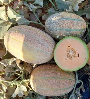 Melon for spring and summer. Early variety with very strong plant and excellent cover. High yield. Oval fruits (2.5–3 kg), small cavity, good netting, very firm flesh, 15 brix, and Long Shelf Life (LSL).